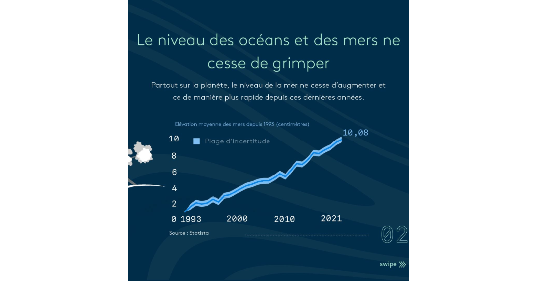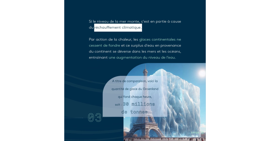 Depuis 1900, le niveau moyen des mers a déjà augmenté de 20 cm. Entre 1993 et 2020, la hausse moyenne est estimée à environ 10 cm. 🌊 Chaque heure, 30 millions de tonnes de la calotte glaciaire du Groenland fondent, ce qui représente une superficie de 5000 km² de glace depuis 1985.